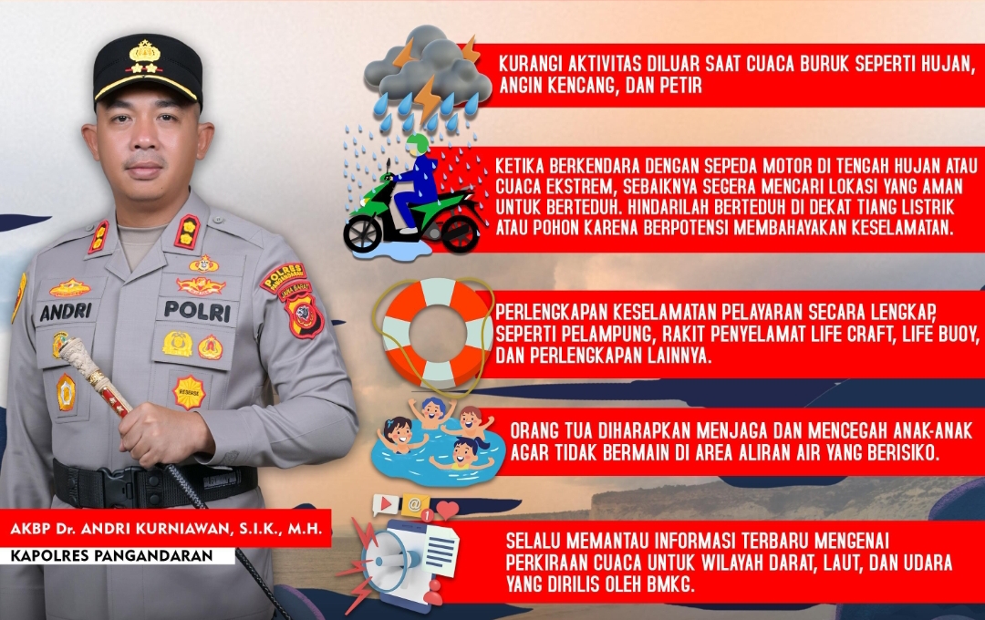 DAILYPANGANDARAN – Kondisi cuaca yang tidak menentu belakangan ini, dengan potensi angin kencang dan gelombang tinggi, mendorong jajaran Polres Pangandaran untuk mengeluarkan himbauan serius. Kapolres Pangandaran, AKBP Dr. Andri Kurniawan, S.I.K., M.H., secara langsung mengimbau seluruh lapisan masyarakat dan wisatawan yang berada di wilayah perairan Pangandaran untuk meningkatkan kewaspadaan.