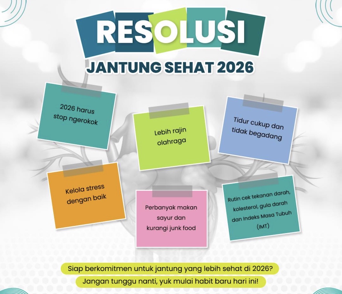 Adapun beberapa hal yang penting untuk menjadi resolusi tahun ini antara lain, 2026 harus stop ngerolok, lebih rajin olahraga, tidur cukup dan tidak bergadang, kelola stres dengan baik, perbanyak makan sayur dan hindari junk food, rutin cek tekanan darah, gula darah dan indeks masa tubuh.